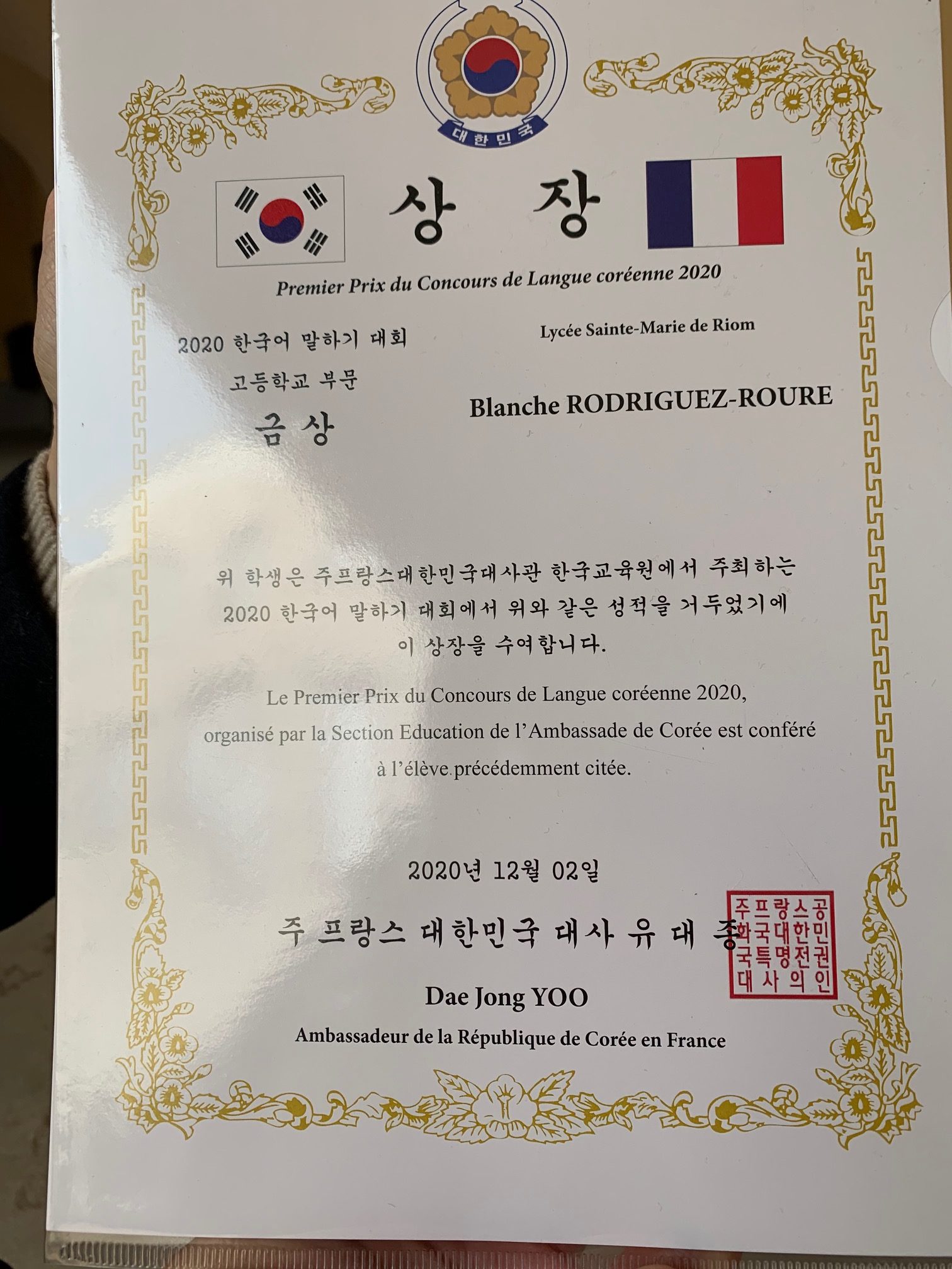 Si ces prix récompensent le travail remarquable de nos élèves, ils récompensent également celui de leur professeure, Mme Sun Young Park, à laquelle l’Ambassadeur de Corée en France, M. Dae Jong Yoo,  vient d’ailleurs de remettre une prestigieuse décoration coréenne pour sa contribution au développement de l’éducation.